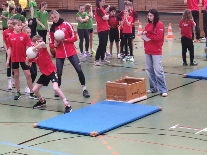 Die dritte Disziplin war eine Pendelstaffel über Hürden, bei der Schnelligkeit, Koordination und Teamgeist gefragt waren. Gelaufen wurde über Hürden in die eine Richtung, das Staffelholz wurde dann übergeben, der Rückweg wurde ohne Hindernisse gesprintet. Für die Auswertung dieser Disziplin wurden die überlaufenen Hürden gezählt, die in der vorgegebenen Gesamtzeit überlaufen wurden. Zum Abschluss folgte das Medizinballstoßen mit einem 1,5-kg-Ball. Hier musste jeweils zweimal mit dem linken und zweimal mit dem rechten Arm gestoßen werden – ebenfalls mit Zonenwertung. Der jeweils beste Stoß ging in die Wertung ein.